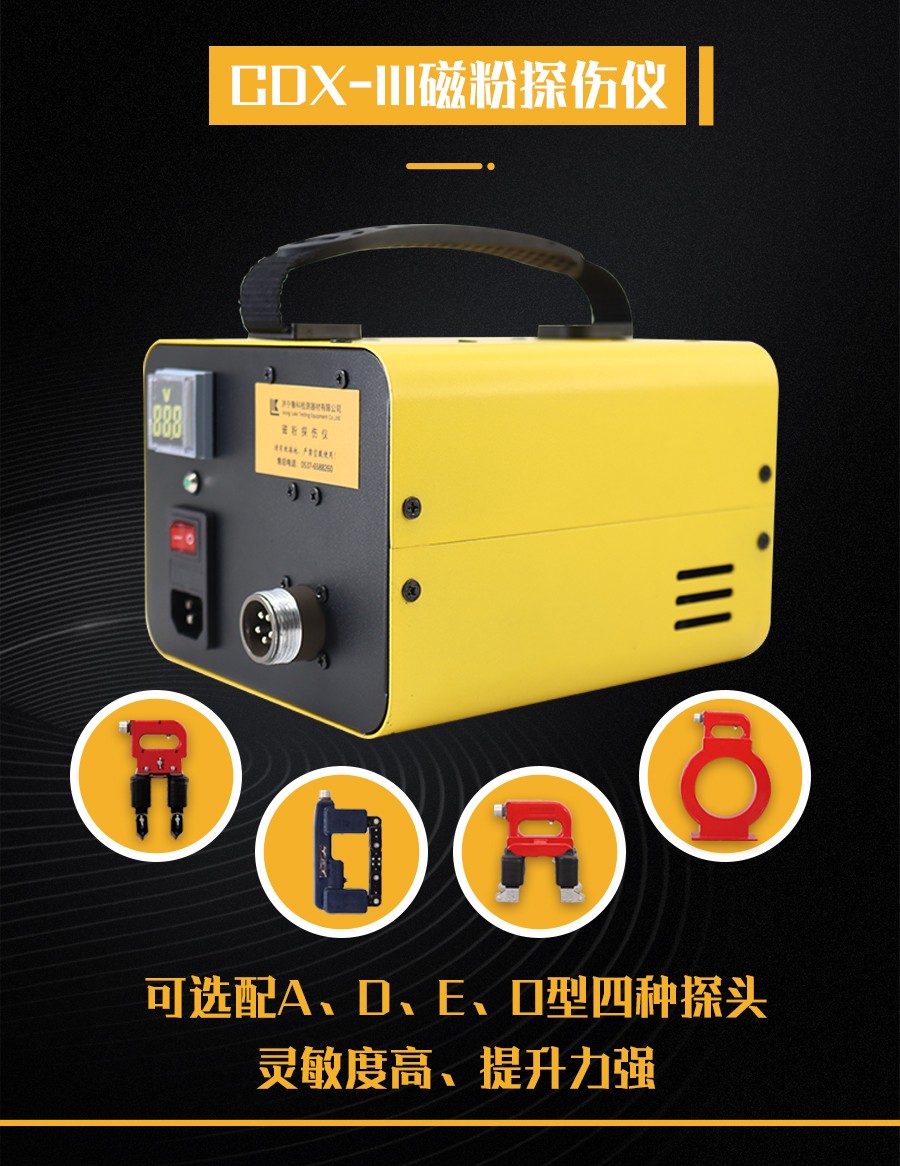 (3)E型探頭:也稱交叉磁軛探頭或旋轉磁場探頭,利用兩只交叉的磁軛采用交流電移相技術,使之產生隨時間變化的復合旋轉磁場,可以對工件一次 磁化,具有探傷速度快、檢測質量高的優點。極距:80mm,提升力AC≥120N,重量:3.5kg;