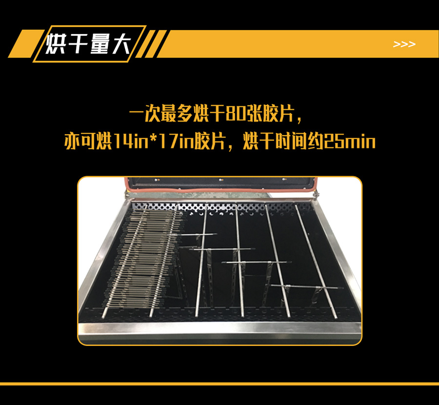 1、一次能烘干80張常規(guī)膠片,亦可烘14in*17in膠片,烘干時間約25min;