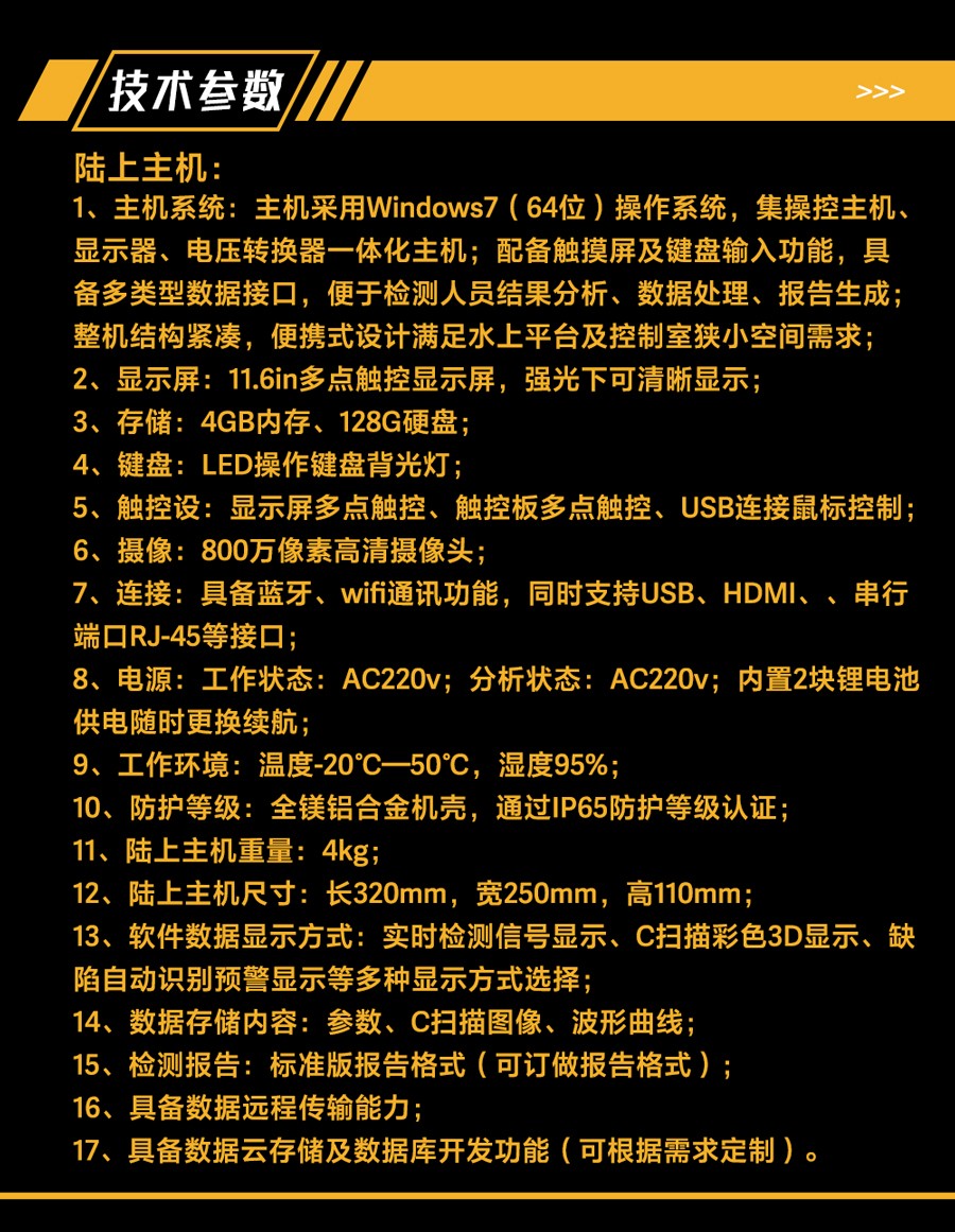 1、主機(jī)系統(tǒng):主機(jī)采用Windows7(64位)操作系統(tǒng),集操控主機(jī)、顯示器、電壓轉(zhuǎn)換器一體化主機(jī);配備觸摸屏及鍵盤輸入功能,具備多類型數(shù)據(jù)接口,便于檢測(cè)人員結(jié)果分析、數(shù)據(jù)處理、報(bào)告生成;整機(jī)結(jié)構(gòu)緊湊,便攜式設(shè)計(jì)滿足水上平臺(tái)及控制室狹小空間需求;