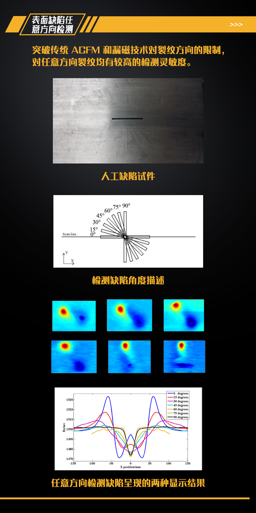 1、交流電磁場檢測技術適用各種導電體材料,主要用于鐵磁性或非鐵磁性材料對于表面或近表面的缺陷可以快速準確的檢出;